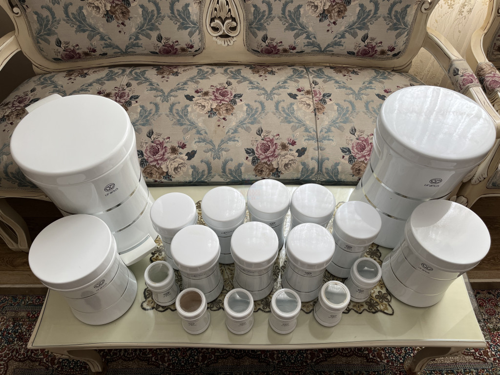 تقریبا نو هستند از ظروف ادویه یکی بعلت دارچین داخلش رنگ گرفته ولی ظاهر و بیزون آن همگی مرتب و خوب است